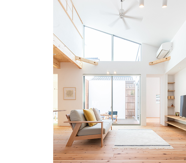![]() ソラマドの家では、中庭が多方向から光と風を取り込み、明るく風通しの良い空間を生み出します。外からの視線が遮られるため、中庭は高い防犯性を持ち、子どもの遊び場や家族団らんなど、プライベートな楽しみが可能です。 また、プライバシーが確保されるためカーテンが不要となり、常に中庭を感じられる開放的な暮らしを送ることができます。 |