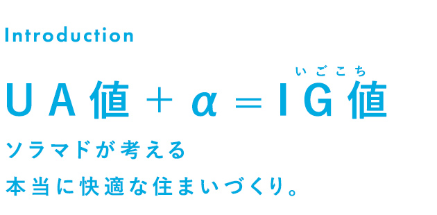 ![]() ソラマドの家は開放的な大きな窓が特長のひとつです。でも、窓が大きいと「断熱性は大丈夫なの?」と心配する声もよく聞きます。もちろん、ソラマドの家は基本的な断熱性能をベースにプランづくりを行っています。住まいの断熱性能はUA値(ユーエーち)という言葉で表すことができますが、UA値だけ気にしても、本当に快適な住まいはつくれません。 私が考える快適な住まいづくりは、式で例えるなら「UA値+α」 その答えをIG値(いごこち)と名付けました。 |