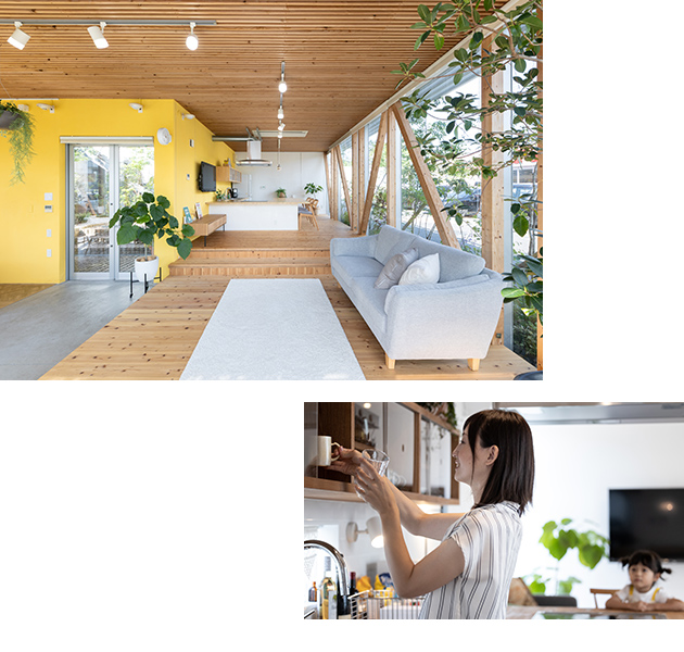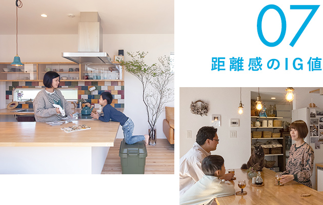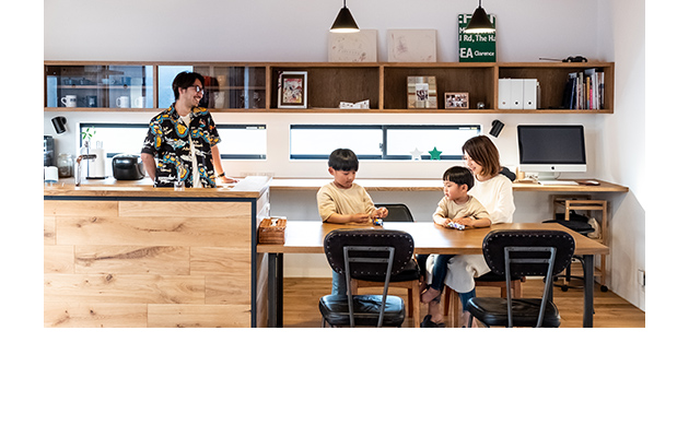 ![]() 住まいの中で、いごこちの良さを決める大切なポイントの一つが家族との距離感です。 コミュニケーションを深めるアイデアとして、カウンターキッチンの床を下げる工夫があります。これにより、料理をする人とカウンターに座る家族の目線が合い、一体感が生まれます。また、ワンフロア内に高低差をつける設計は、空間に変化をもたらしつつ、さりげない独立感を演出する効果もあります。 |