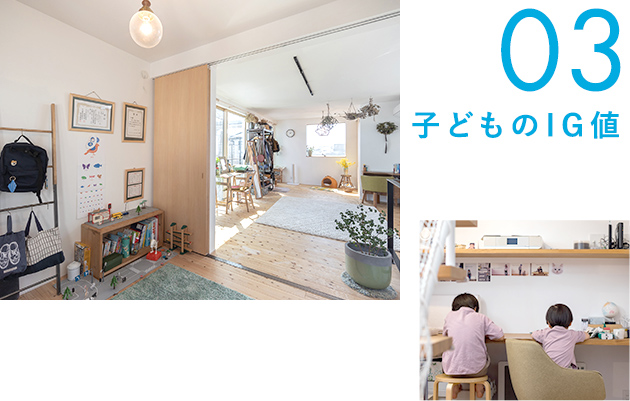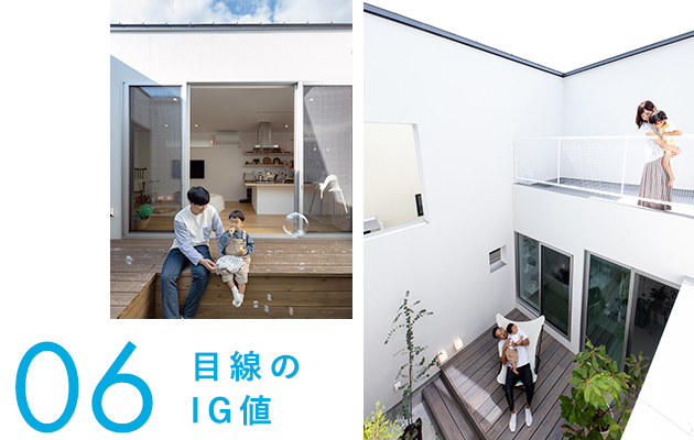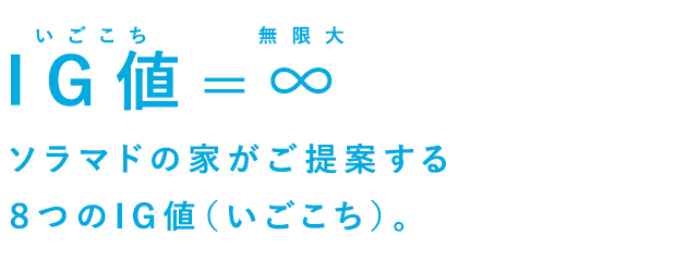 ![]() 白の魅力を最大限に活かす漆喰や、吹抜けの光と風。子どもの好奇心を大きく育てるアイデアから、家族の距離感まで。 ソラマドの家には大きく8つのIG値(いごこち)があります。 |